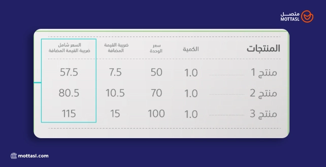 6- تكون هناك ثلاث خانات أخيرة، فيها يتم توضيح السعر بدون ضريبة القيمة المضافة، ثم قيمة هذه الضريبة، وأخيرًا السعر بعد حسابها.