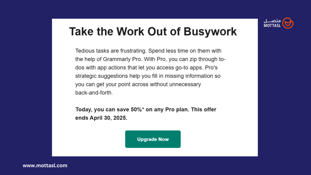 لننظر إلى المثال التالي من Grammarly المنصة المتخصصة في تصحيح الأخطاء الإملائية في الكتابة باللغة الإنجليزية، ومساعدتك في جعل كتابتك بها أكثر احترافية. هنا أرسلت إعلانًا عبر البريد الإلكتروني من أجل دعوة جمهورها المستهدف إلى ترقية الحساب من الاشتراك المجاني للمدفوع مع الاستفادة من خصم 50%. ويبدأ الإعلان من عنوان البريد الإلكتروني حيث استخدموا عبارة قوية تُحفزك على فتح الرسالة.